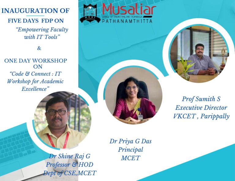 The Department of Computer Science & Engineering successfully inaugurated a Five-Day Faculty Development Program (FDP) on “Tech Vision – Empowering Faculty with IT Tools” and a One-Day Workshop on “Code & Connect: IT Workshop for Academic Excellence.” The event was graced by Prof. Sumit, Executive Director, VKCET, and Dr. Priya G. Das, Principal, MCET, who officially … Continue reading Inauguration of FDP & Workshop & Award Ceremony for S7 Toppers