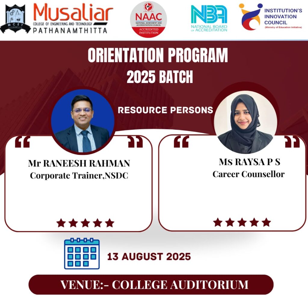 Pathanamthitta, 13 August 2025 – Musaliar College of Engineering & Technology, Pathanamthitta, hosted the Orientation Program and Inaugural Ceremony for the 2025 batch at the College Auditorium, formally welcoming the new students into the institution’s academic community.